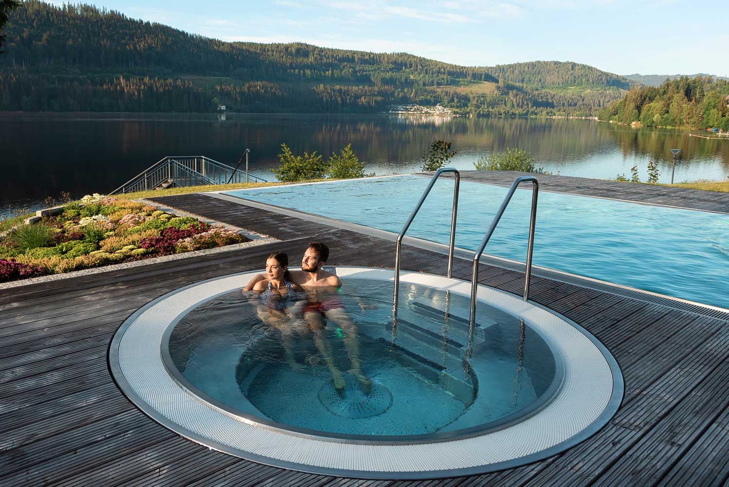Das Hotel bietet eine großzügige Außenanlage mit eigenem Strand und direktem Seezugang zum Titisee. Ziehen Sie Ihre Bahnen im 20 Meter großen Panorama-Infinity-Pool Innen- und Außen verbunden oder relaxen im warmen Außenwhirlpool. Bei uns findet jeder seinen Lieblingsplatz.